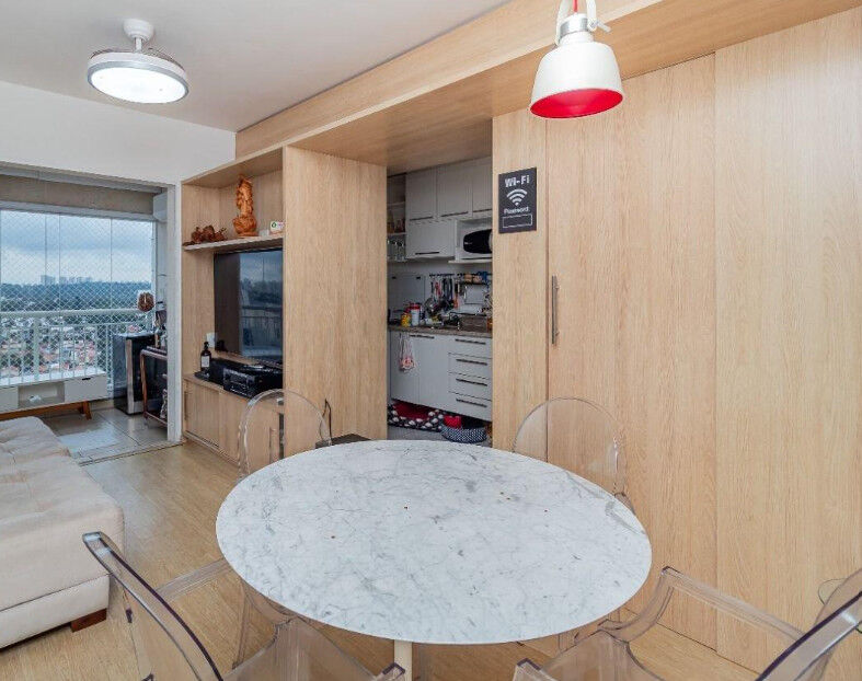 Localizado no tradicional e nobre bairro do Campo Belo, esse magnifico apartamento totalmente mobiliado e entregue com eletrodomésticos conforme fotos, distribuído em uma planta com 47m² com 1 quarto rico em armários embutidos de primeira linha, sala de estar e TV, sala de jantar, conjugada a uma varanda com fechamento de vidro com ar condicionado instalado, cozinha equipada com armários planejados de excelente qualidade, banheiro social, área de serviço e 1 vaga de garagem, fazendo deste apartamento um espaço aconchegante, proporcionando ao futuro morador conforto, praticidade e comodidade que deseja e procura.