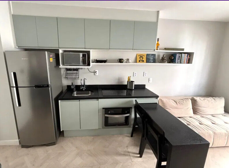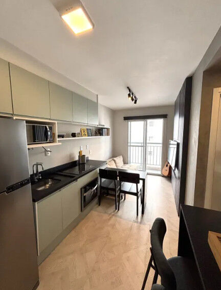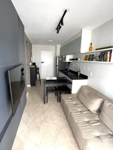 Localizado no tradicional e nobre bairro de Pinheiros esse espetacular Studio, medindo 31m² totalmente mobiliado com marcenaria de qualidade e extremo bom gosto. Quarto com belíssima cama de casal, armários embutidos em todos os ambientes, cozinha equipada com cooktop, forno, microondas, torneira com filtro, banheiro completo com box e espelho, o ambiente de sala tem um lindo painel ripado com TV, cadeiras e mesa belíssima, o terraço arborizado.
