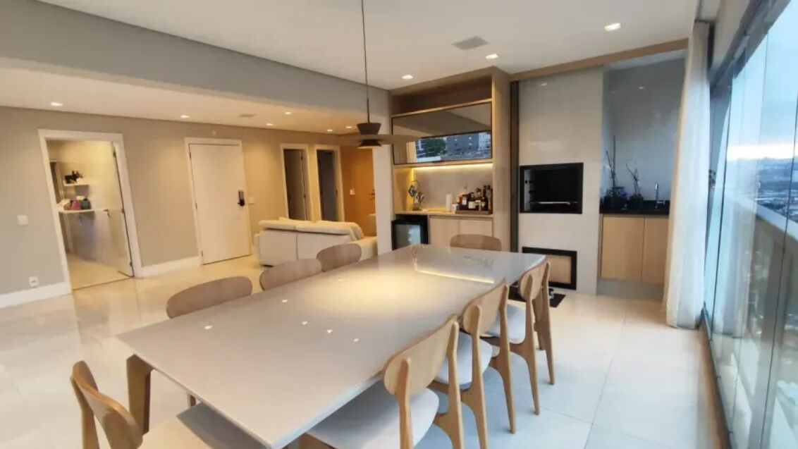 O grande diferencial deste imóvel é a integração total entre a sala e a varanda, que já conta com churrasqueira. Essa união cria um living ampliado e fluido, perfeito para quem gosta de receber convidados com conforto e sofisticação em um ambiente moderno e arejado.
